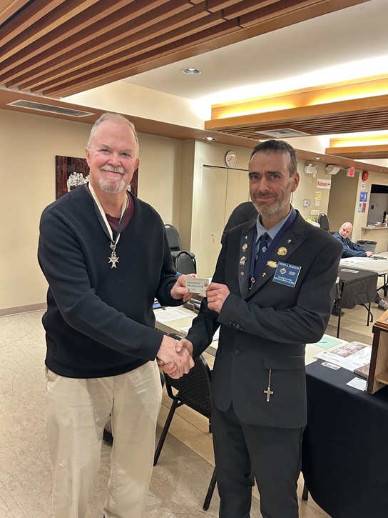 Grand Knight Perry Pearson presenting Chancellor Charlie Whelton with his Honorary Member card