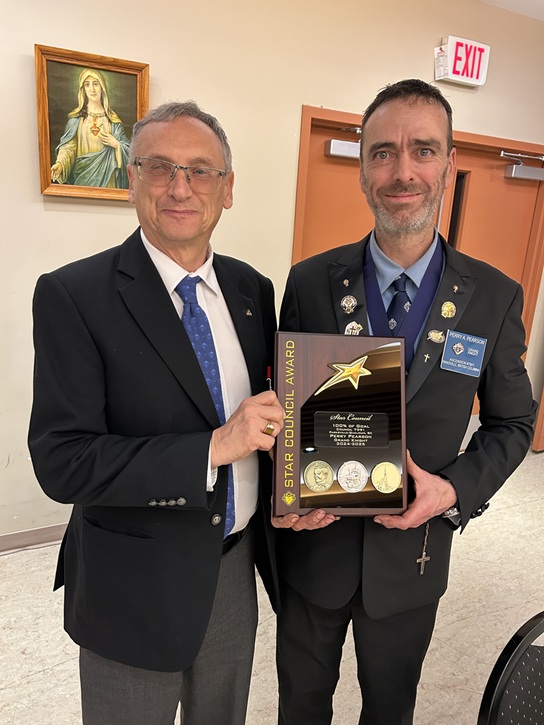 District Deputy Glen Piotrofsky presenting the Double Star Council Award to Grand Knight Perry Pearson